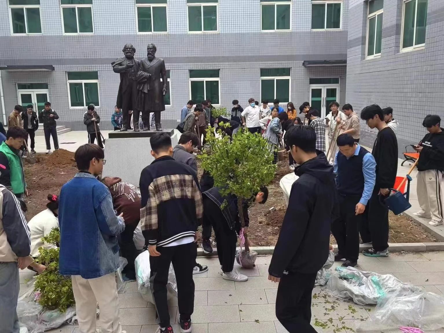 各学院团员代表分成八支种植小组,同学们分工明确,挖土、扶树,浇水互相配合,在同学们齐心协力的劳动中,充满生命力的八颗树在马克思主义广场落地生根。