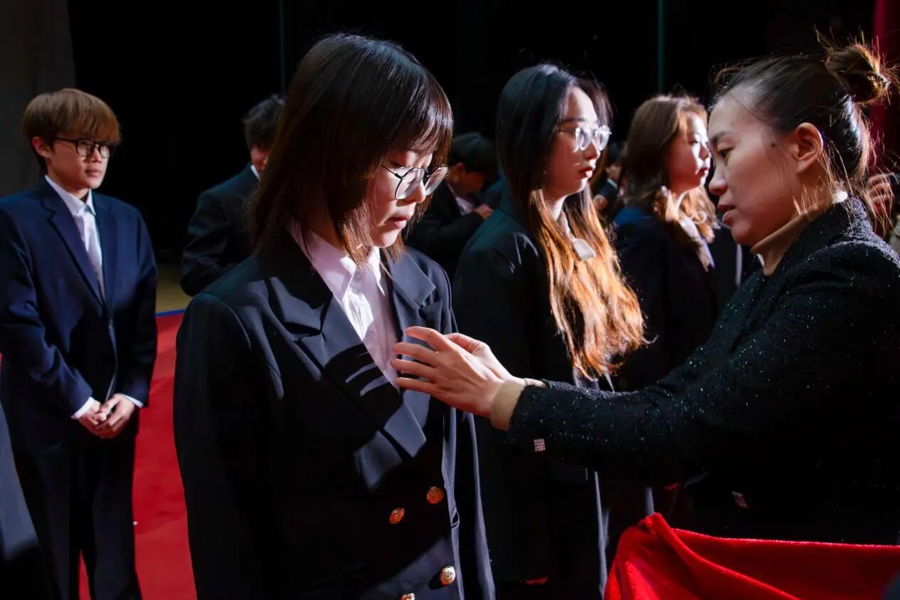 校团委学生兼职副书记张雯硕宣读新团员名单,校团委组织部部长孔丹为新团员代表佩戴团徽。