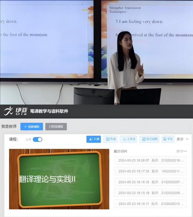 在《翻译理论与实践II》课程中,智慧教学的核心体现在“伊亚笔译教学平台”的应用。该平台通过AI技术赋能翻译教学,覆盖了课前、课中、课后全流程,极大地提升了教学效率和学生的学习体验。