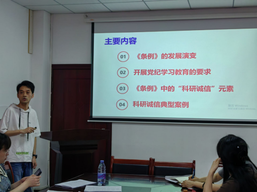 会上,张志鹏副院长以“开展党纪学习教育,筑牢科研诚信基石”为题,从“条例”的演变、开展党纪学习教育的要求、“条例”中的科研元素、科研诚信典型案例等四个方面作主题汇报。