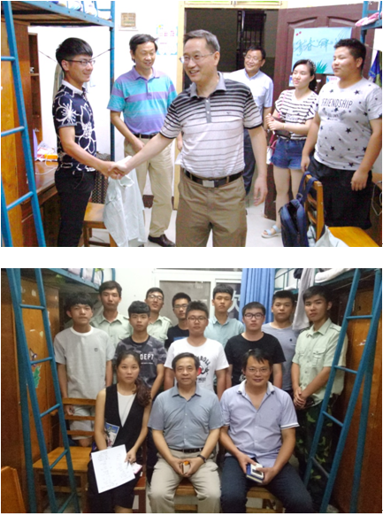 走进寝室,老师们认真查看了同学们的生活环境,然后或站立,或围坐,悉心了解同学们的个人经历、家庭情况,关心同学们生活上有什么困难,军训吃不吃得消,伙食习惯不习惯,也让同学们聊聊对大学生活有什么想法,对学校有什么要求建议,或是与同学们分享自己的大学生活经验,以勉励同学们珍惜难得的大学时光,激励起大家努力成为国家有用之才的热情和信心。比如彭书记就谈到同学们在大学期间要注重培养自己正确的核心价值观,“核心价值观的养成绝非一日之功,要坚持由易到难、由近及远,努力把核心价值观的要求变成日常的行为准则,进而形成自觉奉行的信念理念!”张书记则建议同学们不断提升自己的思想境界,“同学们要不断学习、提高认识,努力把自己的思想境界上升到国家民族的高度上来。”他们的话语中都饱含对同学们成长成才的殷殷期望。