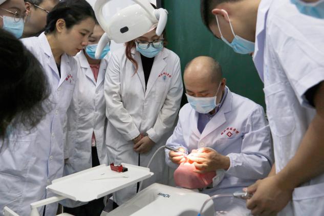 首先,杨教授为师生讲述了贴面牙体预备的基本步骤,帮助大家初步熟悉预备流程和注意事项。随后,杨教授在仿真头模上示教右上中切牙贴面的牙体预备,全体师生近距离认真观摩学习,兴致高涨。接着,学生分别进行实操练习,杨教授为大家一一指导点评,提出宝贵意见,指出勤加练习是成功的关键。最后,杨教授向大家分享了临床病例,他强调贴面的难点不在于牙体的预备,而是方案的设计与分析。