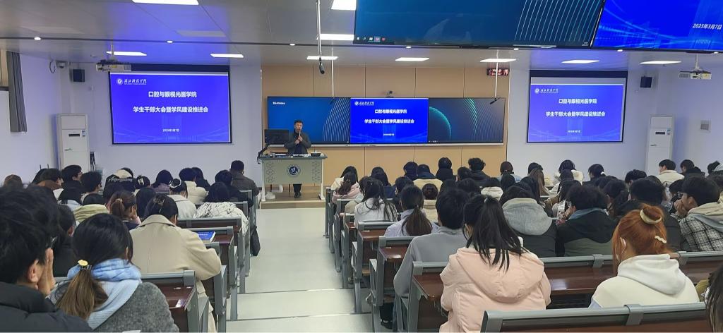为进一步加强学风建设,营造良好的育人氛围,提高人才培养质量。3月7日中午,口腔与眼视光医学院在教五-101教室召开全体学生干部大会暨学风建设推进会。会议由学工办副主任周彦主持,党委副书记程鹏出席并总结讲话。