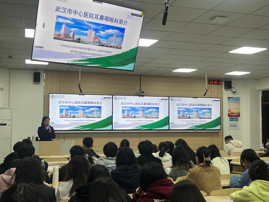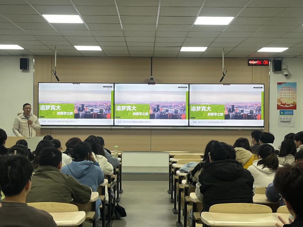 为帮助学院2025届毕业生深入了解住院医师规范化培训(以下简称“住培”)政策,拓宽就业渠道,提升职业发展能力,4月1日晚上,武汉市中心医院耳鼻喉头颈外科主任陈伟一行五人应邀来我院开展住培宣讲会。本次宣讲活动由学院就业辅导员周彦主持,2021级、2022级、2023级眼耳鼻喉专业学生现场参加,2020级眼耳鼻喉专业学生通过腾讯会议参加。