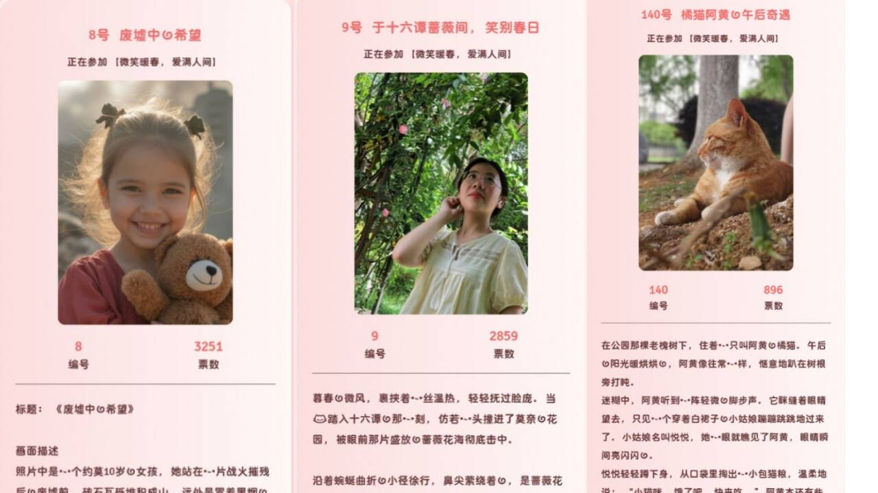 活动以“微笑为核心,设置线上故事分享与微笑展示环节,内容涵盖同学互助、师生互动、陌生人善意传递等真实场景。参与者通过图文、短视频等形式记录身边温暖瞬间,展现真诚微笑。活动期间,投稿作品累计超过200份,话题阅读量突破上千次,引发学生共鸣。通过线上投票,最终评选出20份“人气作品”,其中最高票数达3251票。不少学生表示,活动为情感宣泄提供了出口,帮助他们在忙碌学业中重新发现生活中的美好,更深刻理解了“微笑不仅是表情,更是积极的生活态度”。