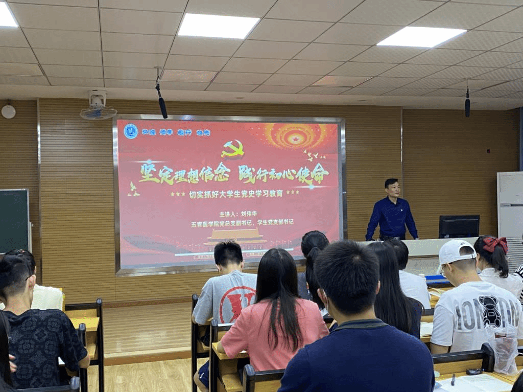 (通讯员:涂芳)为了深入学习宣传习近平新时代中国特色社会主义思想,推进党史学习教育走深走实、入脑入心、见行见效。5月8日晚7:30,五官医学院党总支副书记、学生党支部书记刘伟华在6-402多媒体教室为学院全体学生党员、发展对象、入党积极分子200余人讲授《坚定理想信念,践行初心使命—切实抓好大学生党史学习教育》的专题党课。