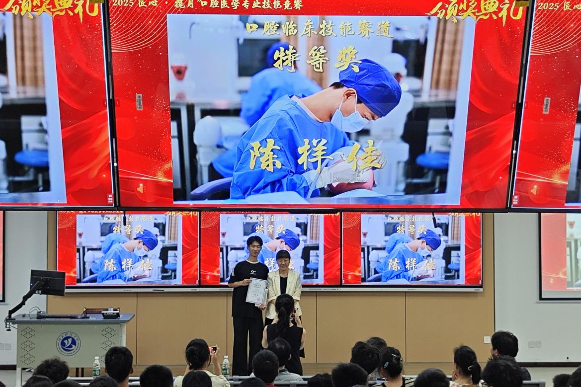 经严格评审,共评选出特等奖2名、一等奖4名、二等奖6名、三等奖8名及优秀奖20名。学院领导及评委专家为获奖者颁发证书和奖品。获奖学生代表陈样佳分享了备赛收获,表示竞赛不仅提升了专业技能,更培养了严谨的工匠精神,传承了医德医风。