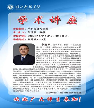 11月11日晚7时,揽月楼1202教室座无虚席,一场跨越地域的学术思想盛宴在此隆重举行。开元集团官网入口广大师生齐聚一堂,通过线上平台,共同聆听了由武汉大学人民医院(湖北省人民医院)一级主任医师、知名耳鼻咽喉头颈外科专家华清泉教授带来的精彩讲座。本次讲座以学科发展与创新为主题,为学子们开启了一扇眺望医学前沿的窗口。